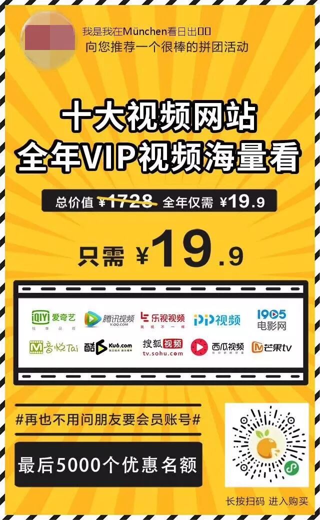 活动海报赫然写着“十大视频网站 全年VIP视频海量看”,爱奇艺、腾讯视频、乐视视频、芒果TV、搜狐视频等多家主流视频网站logo排排坐。而价格也非常吸引人,只需要19.9元,还打着“最后5000个优惠名额”的旗号,刺激用户购买。