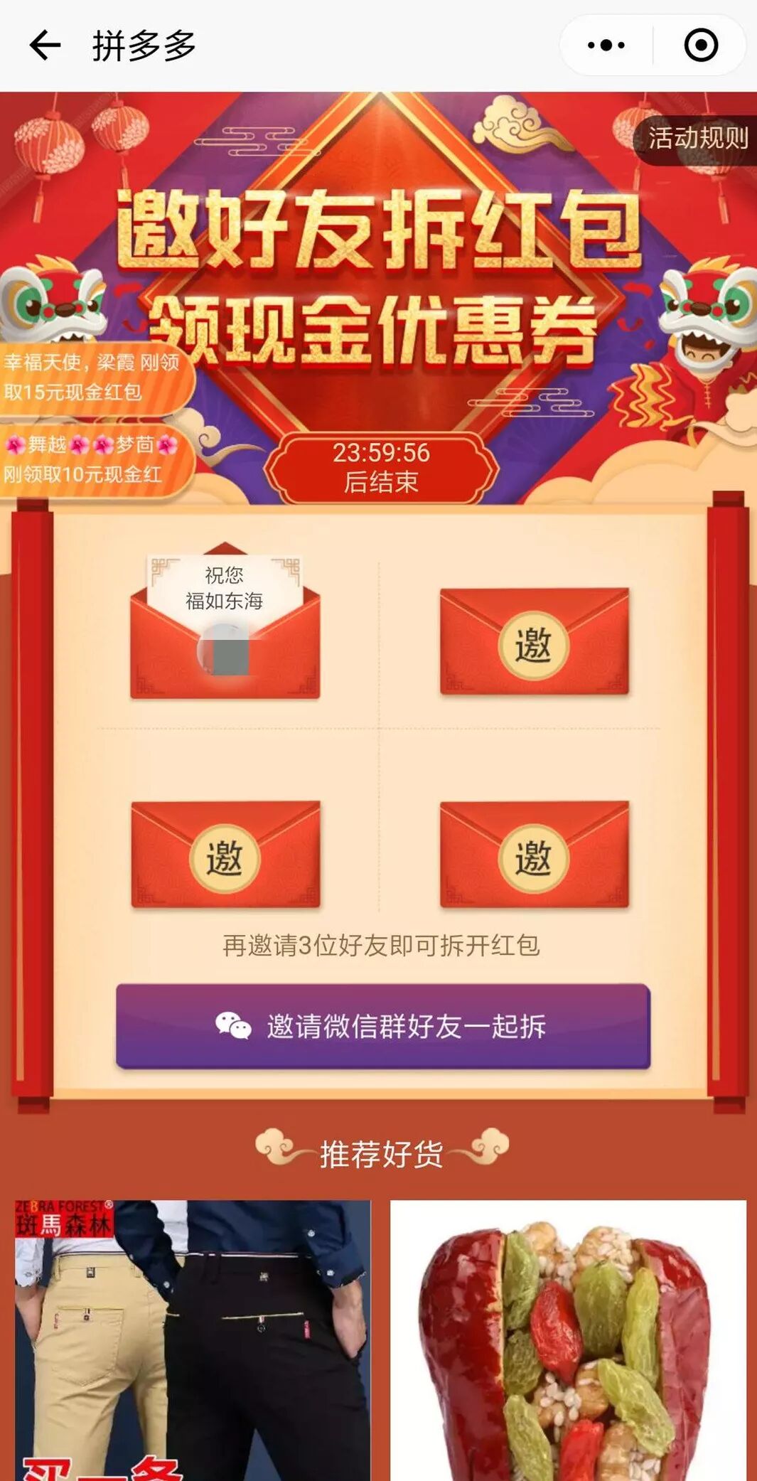 拼团可以说是拼多多的基础玩法。哪怕只是刚打开小程序,也会立刻弹出一个拼团凑红包的界面,鼓励用户邀请好友共同拆红包。
