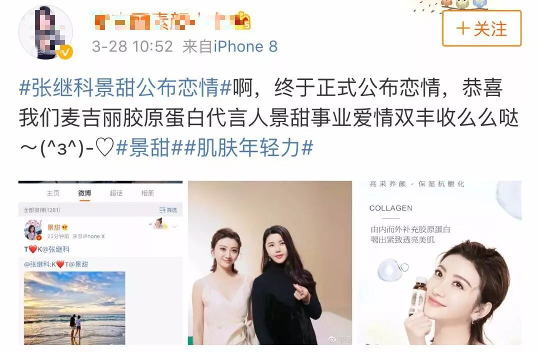 不过景甜张继科恋情公开后,最热情的竟是一微商品牌麦吉丽胶原蛋白。微商们连忙送上祝福,恭喜自家代言人左手事业,右手家庭,双丰收!