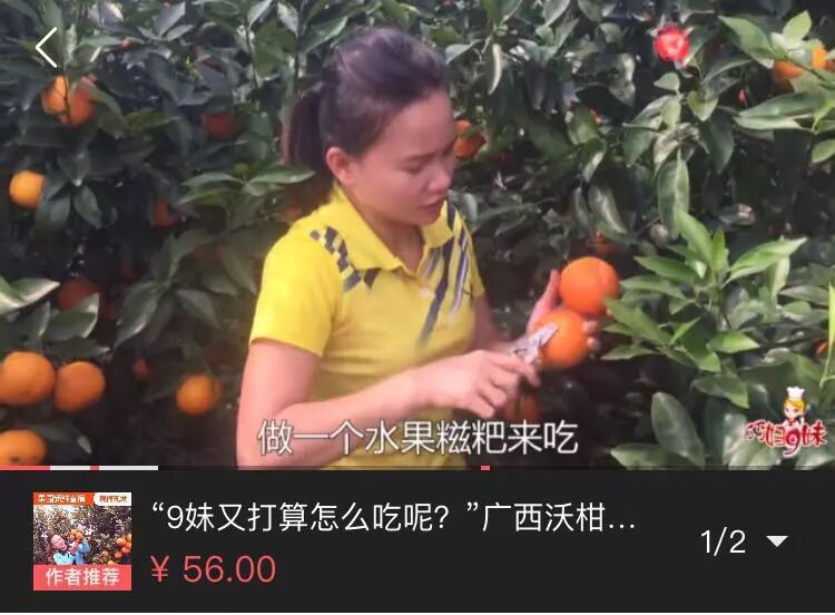 比如9妹摘果的时候,到了最诱人的果肉特写画面时,插入产品展示的卡片。引导的文案也可以更加生动活泼,因为橘子是火红火红的,就像准备出嫁的姑娘,就加上了“我就要出嫁了,谁来娶我呢?”这样让人有点击欲的句式。