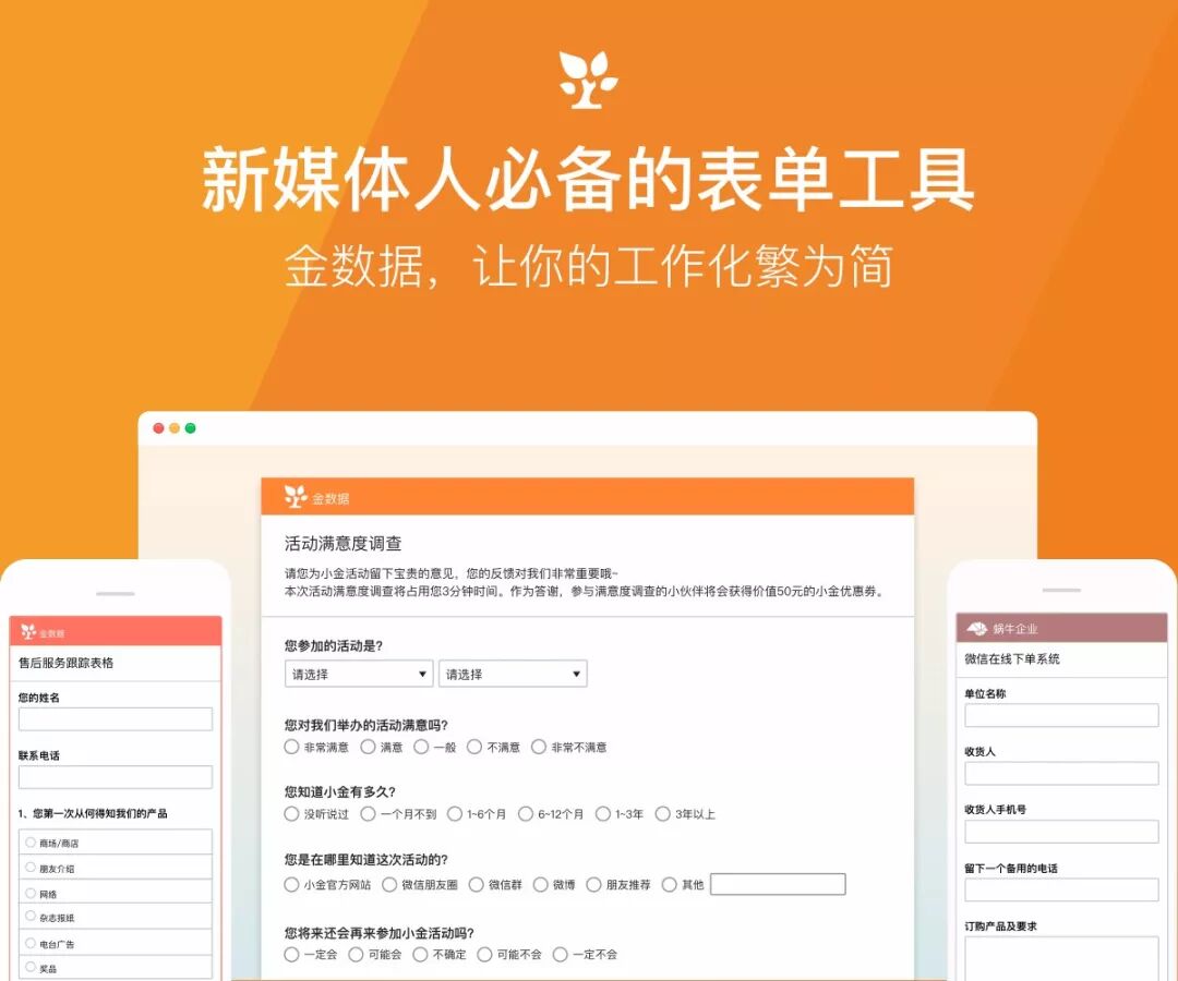 简单好用的表单工具,帮助收集和管理新媒体运营工作中的数据,从问卷调查、活动报名到预约登记、在线下单,PC、手机APP、小程序,全终端覆盖。 新媒体团队还可以使用金数据搭建营销系统,比如投票、在线抽奖、考试测评、发红包、营销落地页等等。你所知道的许多新媒体大V都在使用金数据,提升运营效率,让聪明的你,更聪明的工作。