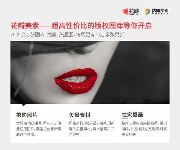 基于对艺术价值的重视,花瓣美素在传媒产业的盛行之下,建立一个专为用户打造的图库平台,保障图片的正版版权。用户群不必再时刻担心侵权问题,并且提供多样化的授权方式,以及便捷的使用体系,能在线上完成所有流程,让用户在使用上能更省时,提升效率。