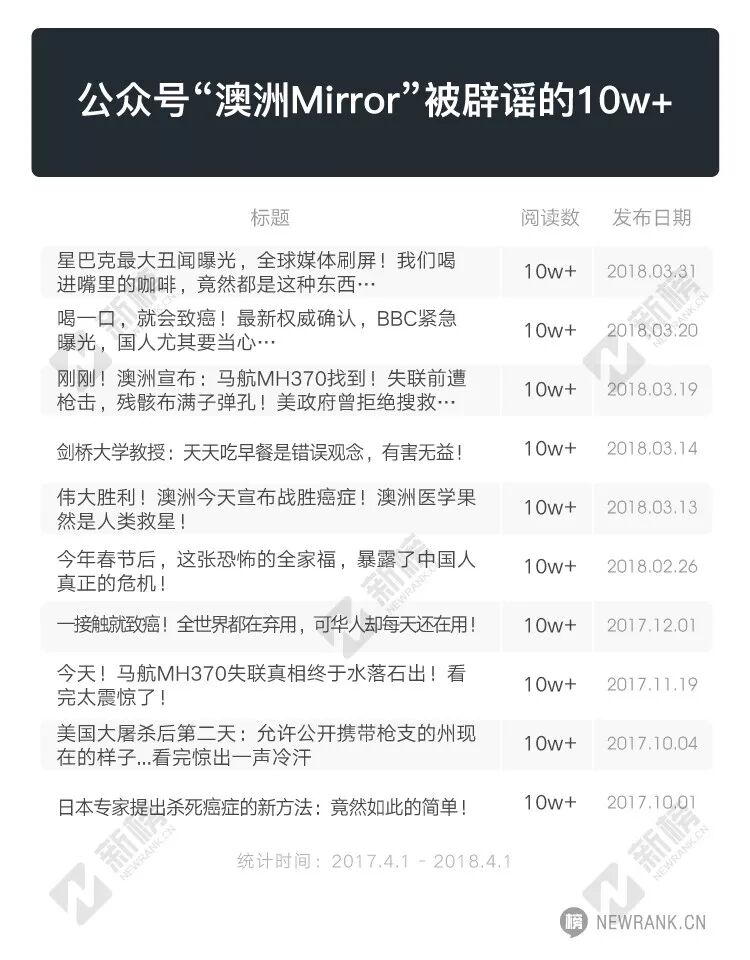 根据新榜公众号回采,过去一年,“澳洲Mirror”共产生了45篇10w+,其中被微信辟谣助手判定为谣言的文章确实有10篇。
