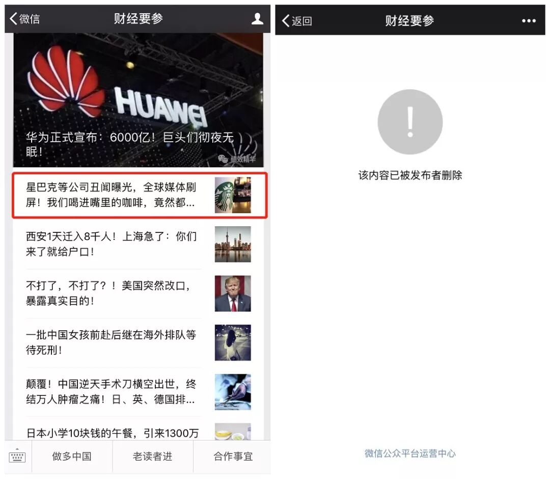 “财经要参”“华人生活网”“咖啡精品生活”的文章页面则显示“该内容已被发布者删除”。