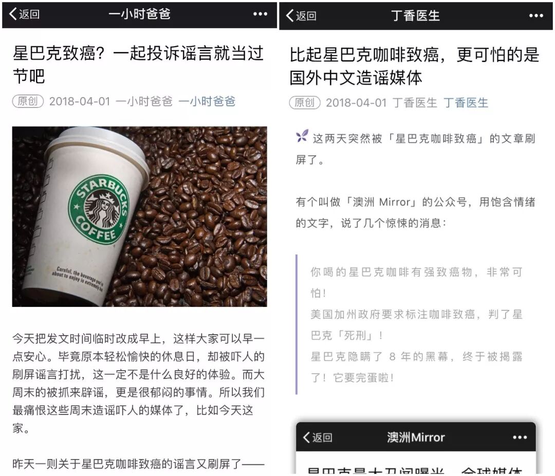 还有一篇辟谣依据,是来自健康类大号“丁香医生”的《比起星巴克咖啡致癌,更可怕的是国外中文造谣媒体》。