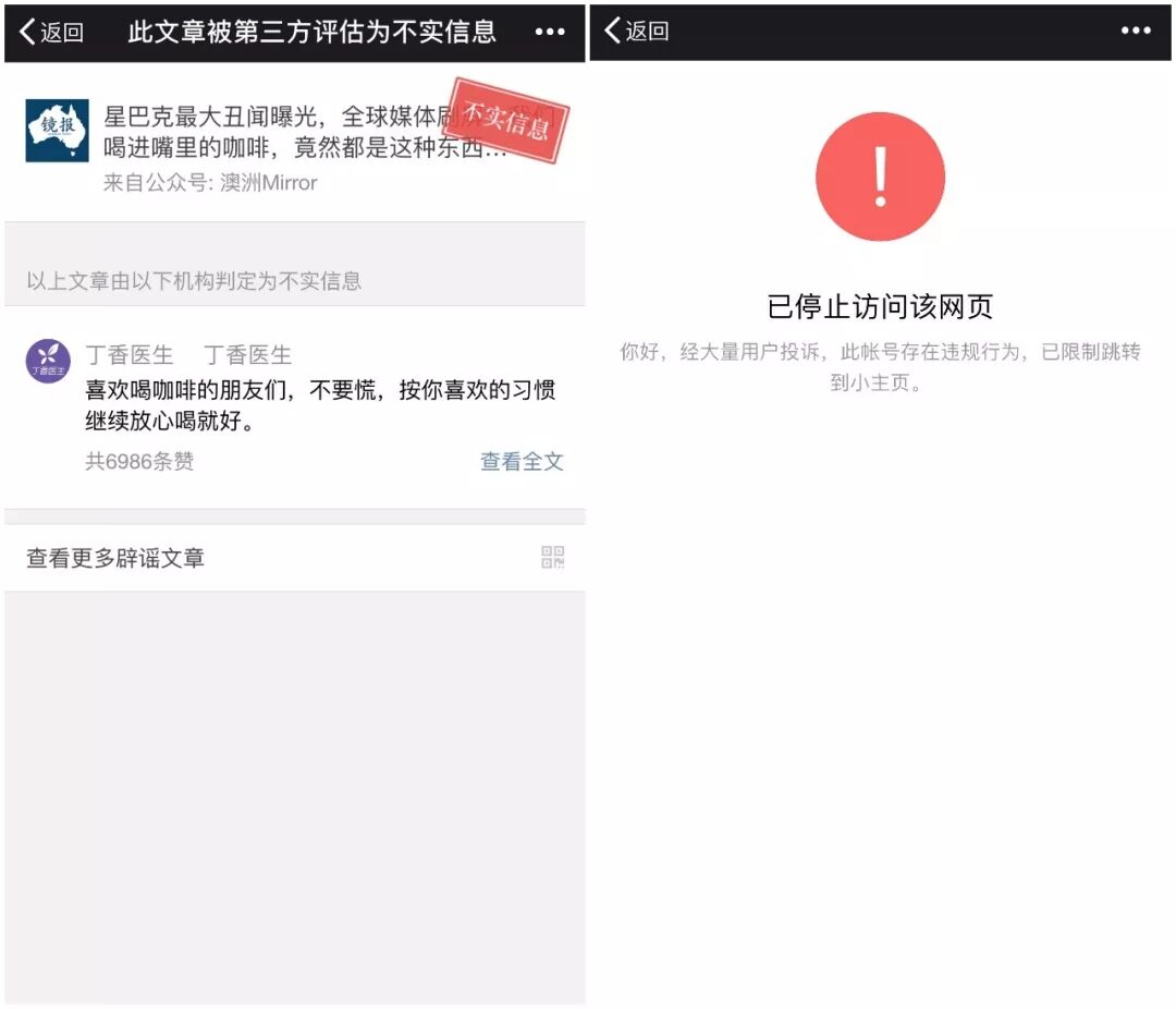 在微信官方的辟谣小助手页面显示,传播“咖啡致癌”文章主要被两篇辟谣文章判定为“不实信息”,其中一篇是腾讯官方辟谣机构“全民较真”的《一文读懂“星巴克致癌”传言:营销号乱吓人咖啡想喝就喝》。