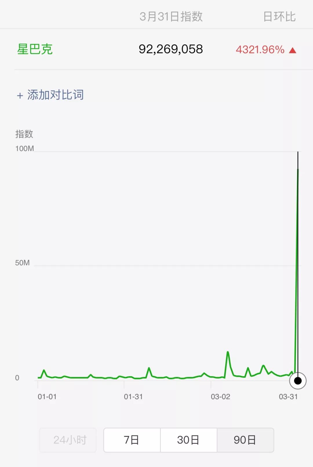 通过这条“星巴克”的微信指数线条,一眼可以看出谣言在社交媒体上释放出的巨大能量。此前90天里,“星巴克”的微信指数几乎贴着地面水平滑行,3月31日陡然爬升,瞬间被拉到最高点,微信指数突破9000万。