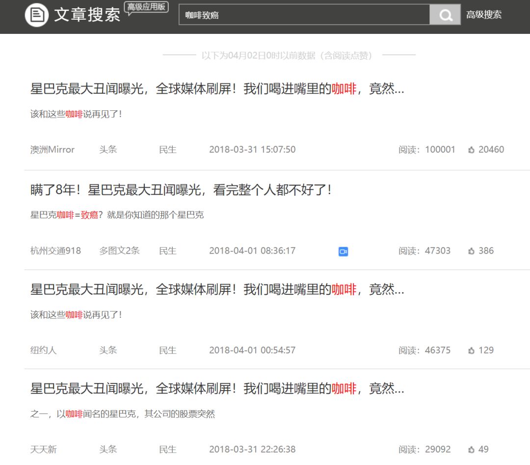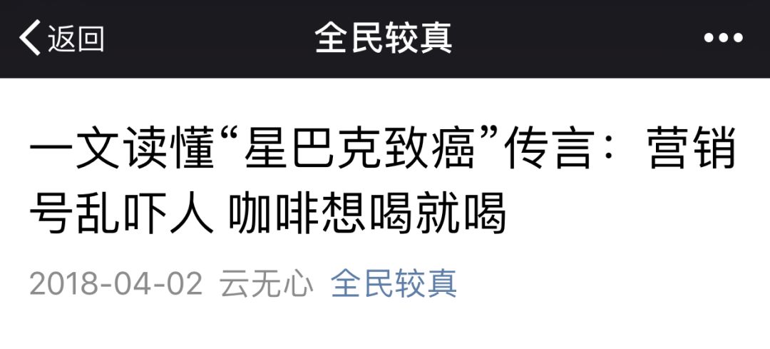 回到星巴克,一方面是全球知名的咖啡连锁品牌,另一方面是每天都可能会喝到的咖啡,加上“致癌”二字,很多公众号都“扑了上去”。