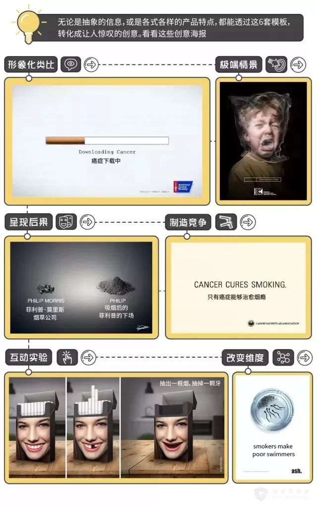国际营销学教授Jacob Goldenberg曾做过一项研究,他发现在200例国际创意大赛的获奖优质作品中,有89%的都可以归入6个创意模板。而最的糟糕广告,只有2.5%遵循过其中一个模板。