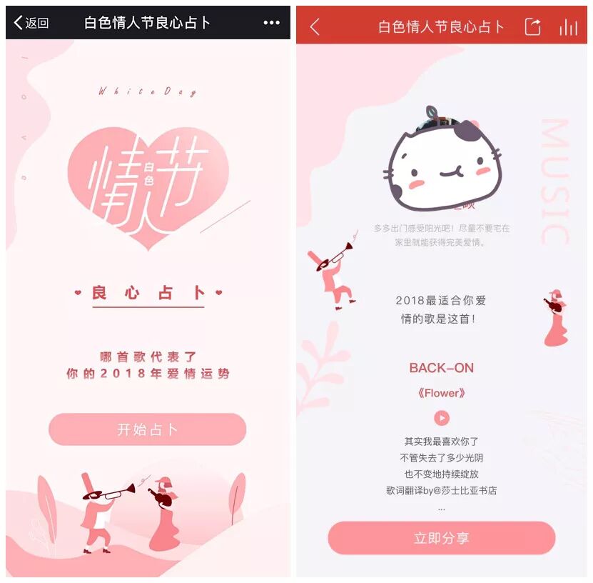 今年白色情人节,网易云音乐推出过一支占卜类H5,测试2018年的爱情运势和最适合你的一首歌。