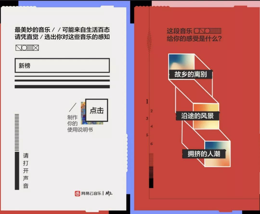在视觉上,网易云音乐h5也有意突出独家定制感。榜妹细数了下,《使用说明书》海报至少有红色、粉色、紫色、绿色、橙色、深蓝色等多种颜色。