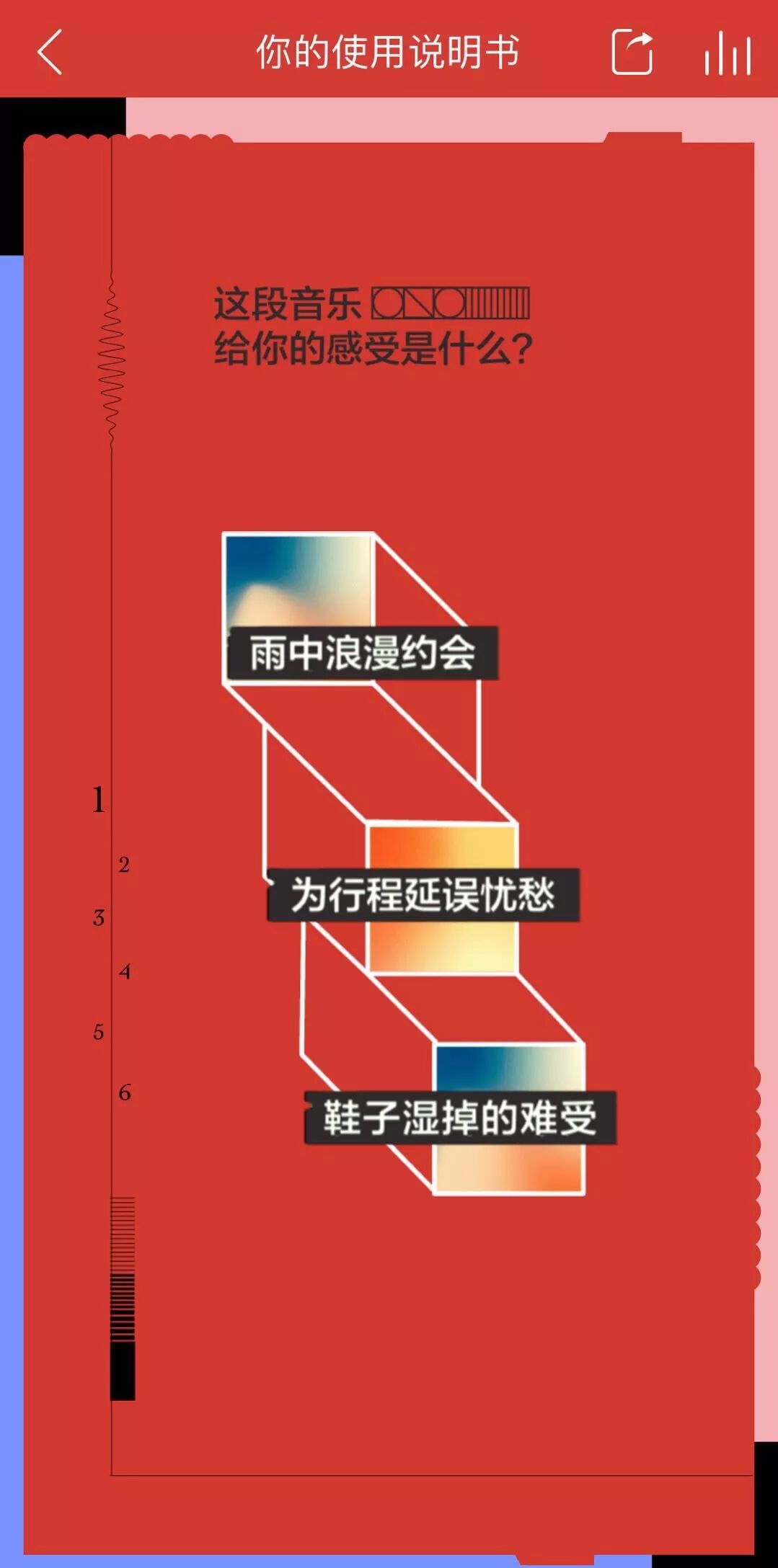与以往测试题不同,网易云音乐的测试以音乐元素为主,简单来说就是——你需要根据听到的音乐,来选择与自己心境最贴合的选项。