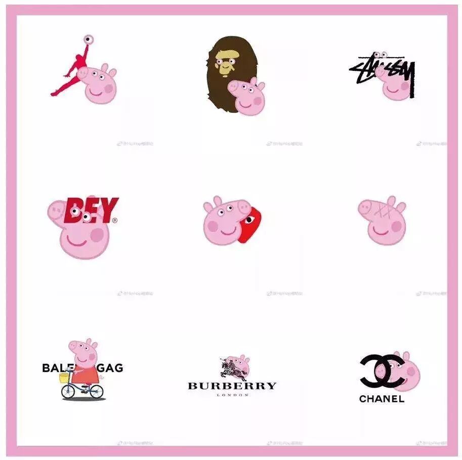 而另一方面,小猪佩奇在服装界不断推出联名款,比如Nike、优衣库等,国外某些人故意恶搞了小猪佩奇和一些奢侈大牌、潮牌,将这只粉色小猪P进了他们的logo里去,非常好玩: