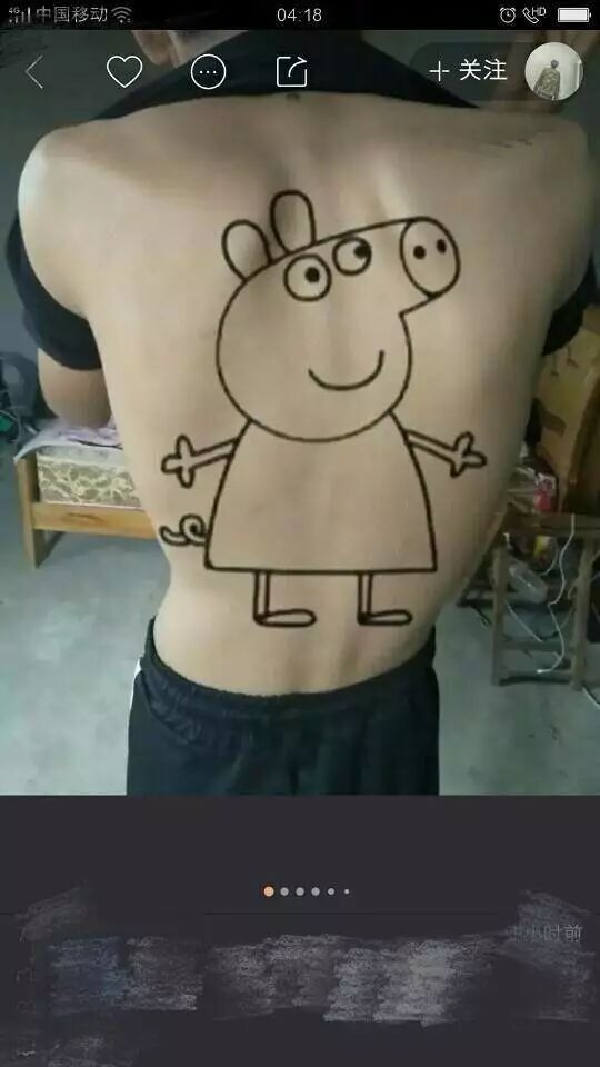 这个梗最早其实是从快手上某MC发源起来的,一句“小猪佩奇身上纹,掌声送给社会人”带动了快手上小猪佩奇的流传,其实一开始流传的时候并没有这么多的追捧的人,真正开始是在这张图片以后:有人把小猪佩奇画在了背上。