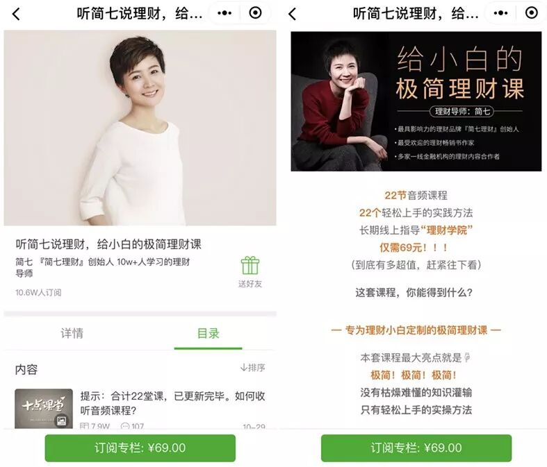 后来,和“十点读书”独家合作的课程《给小白的极简理财课》定价69元。借着十点读书的巨大流量,一年销售量破10万。