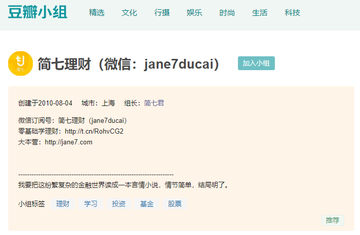 更早先时候,喜欢分享自己生活的简七,开始在豆瓣记录自己看待这个世界的方式。现在打开豆瓣搜索“简七读财”,她2010年创办的豆瓣小组,显示成员11.4万。