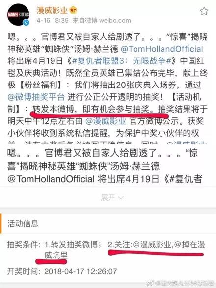 但其实从3月底至今,漫威影业官微在活动宣传上频频遭到粉丝吐槽,“这两天官宣的剧情恐怕比复联3还要精彩”。