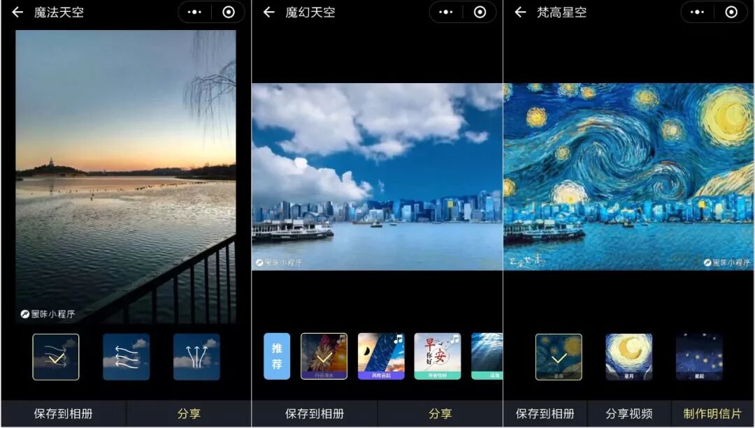 小程序和App提供的功能和定位也可以不同。以黑咔相机为例,目前小程序上有四大类近百套特效,而上线一年多的黑咔相机App,则只有专注天空变幻的数十款滤镜。两款产品对图片的处理程度也不尽相同,前者屡屡更新类似抖音的视频特效,后者则更偏向类似Prisma的精致滤镜。