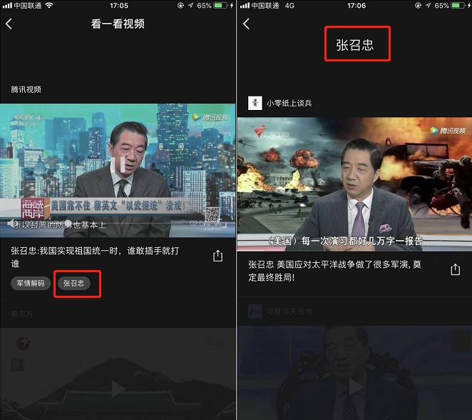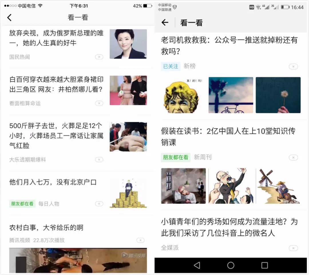 为了得到相对客观的使用体验,我们将常用个人微信与新注册微信的“看一看”进行比较,发现新注册的个人微信推荐的内容水平比较低,也是各类猎奇段子、标题党、震惊小视频满屏飞。而订阅更多公众号、阅读使用更频繁的微信号,“看一看”的推荐就精准得多。