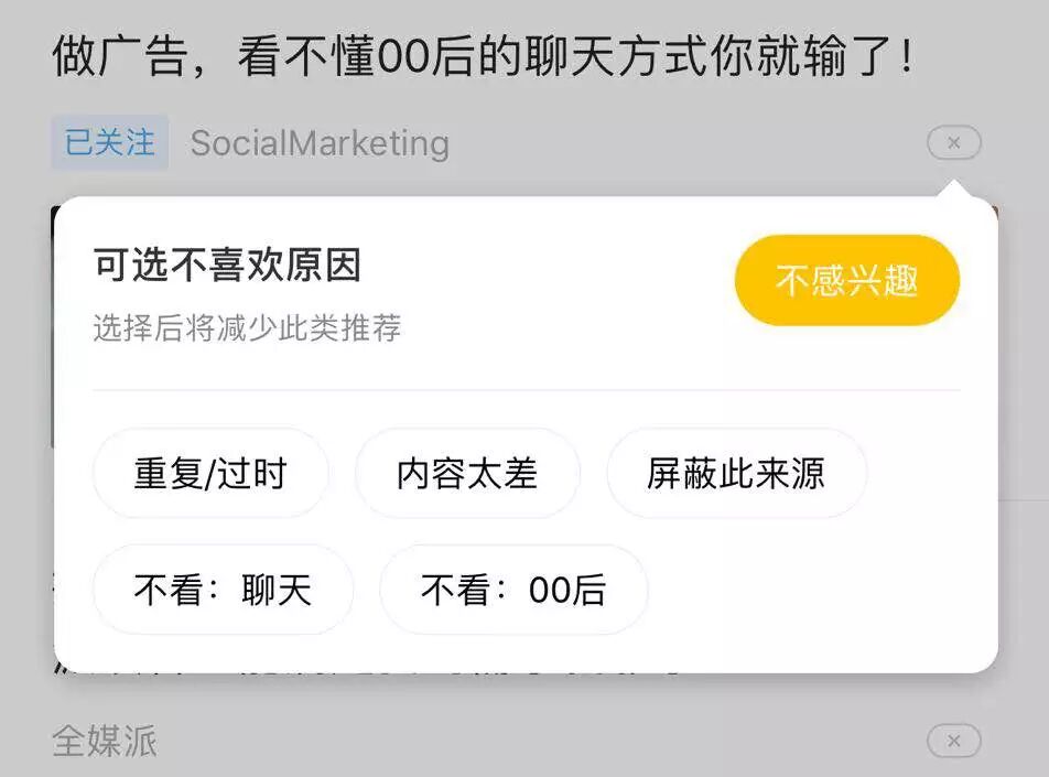 比如,在一篇题为《做广告,看不懂00后的聊天方式你就输了!》的文章下,不喜欢的原因可以是“不看:聊天”,或“不看:00后”。