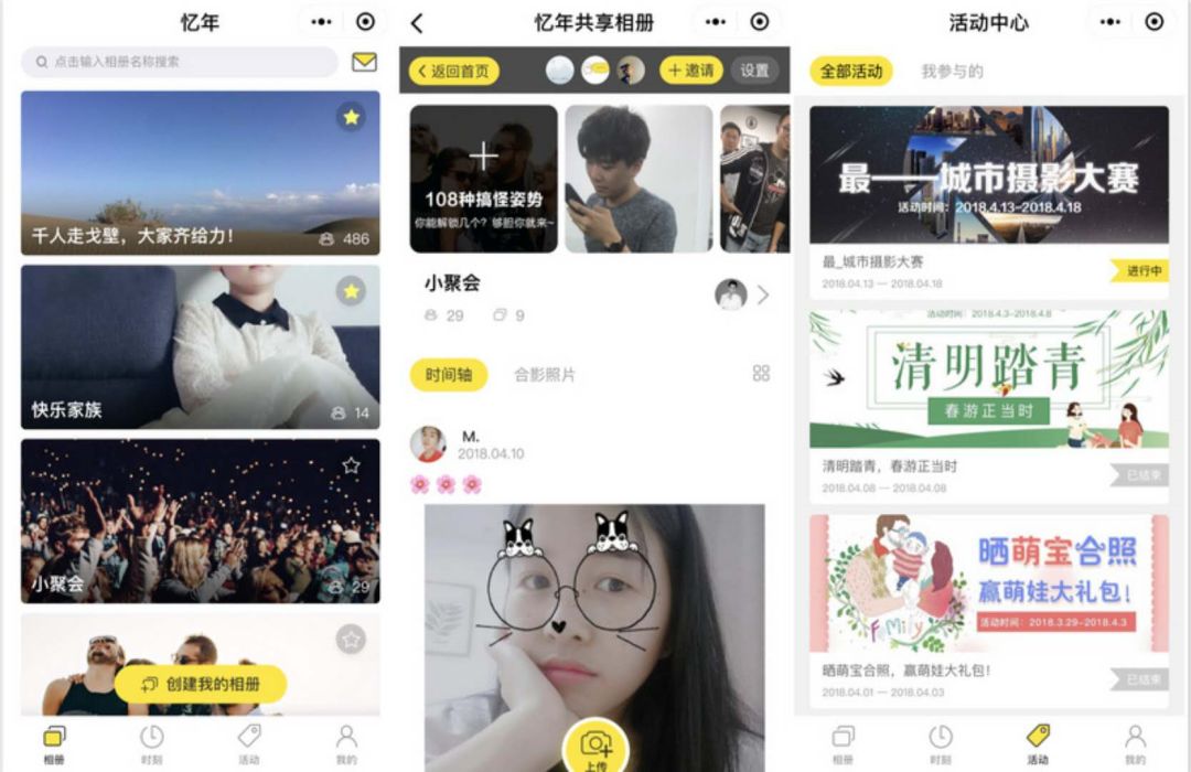 忆年创立于2015年,做过App和PC版。2017年1月9日,上线小程序版 “忆年共享相册”,主打共享私密相册。用户可以通过小程序,根据主题创建相册,和家人、朋友、同事共享并存储照片和短视频。