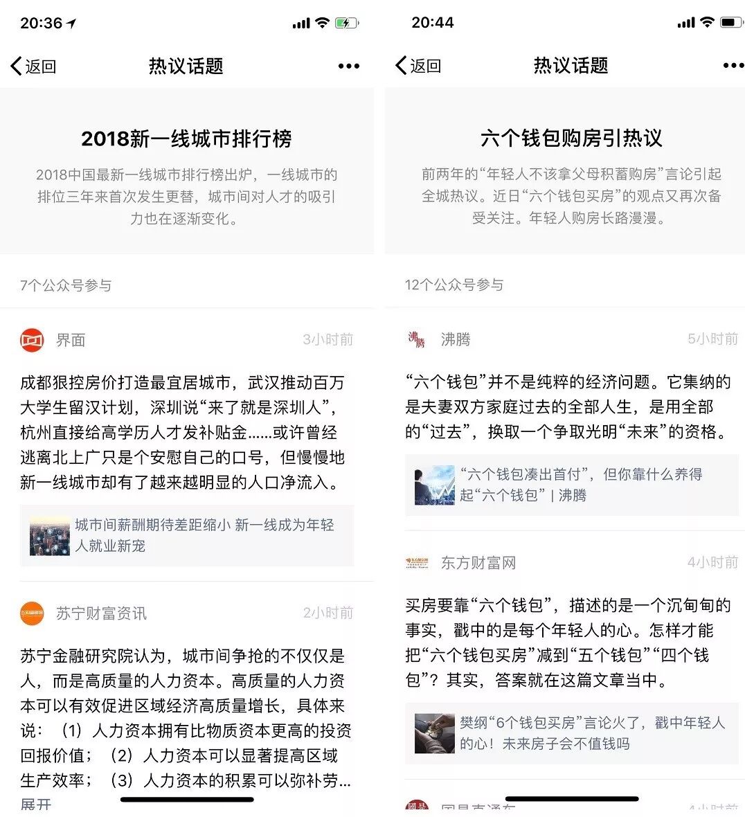 在某一热议话题下,会出现由不同公众号讨论同一热点话题的文章及观点列表,包括参与话题的公众号数量、公众号头像+名称、文章核心观点、公号文章头图+标题,类似于朋友圈分享文章的界面。点击公众号头像,直接进入公号的历史消息页。