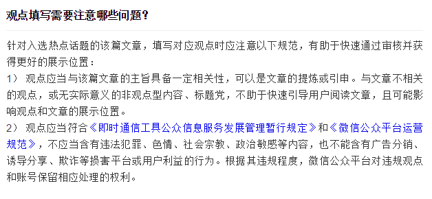 而页面上的观点是由公众号管理员在接受邀请后,自己撰写和提交。在填写观点时,微信也设定了一些规范,“有助于快速通过审核并获得更好的展示位置”。规范包括:要与文章主旨一致,可以是文章的提炼或引申(会影响展示位置);应符合相关规范。
