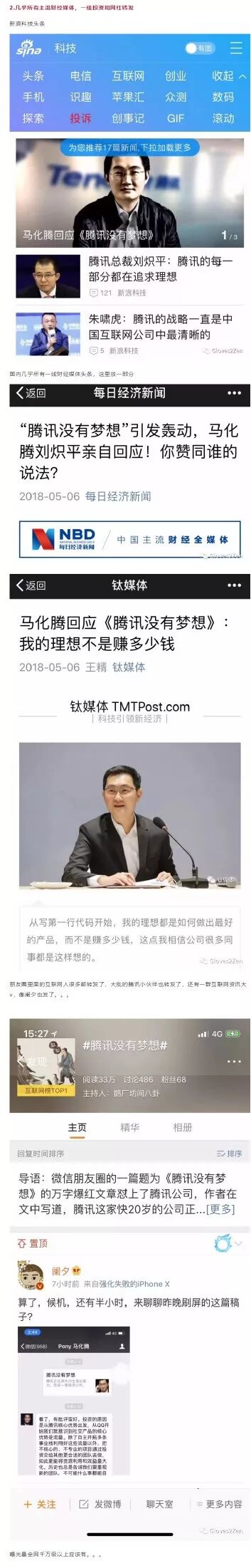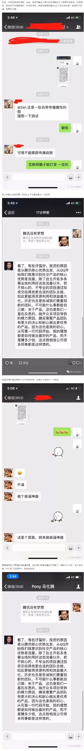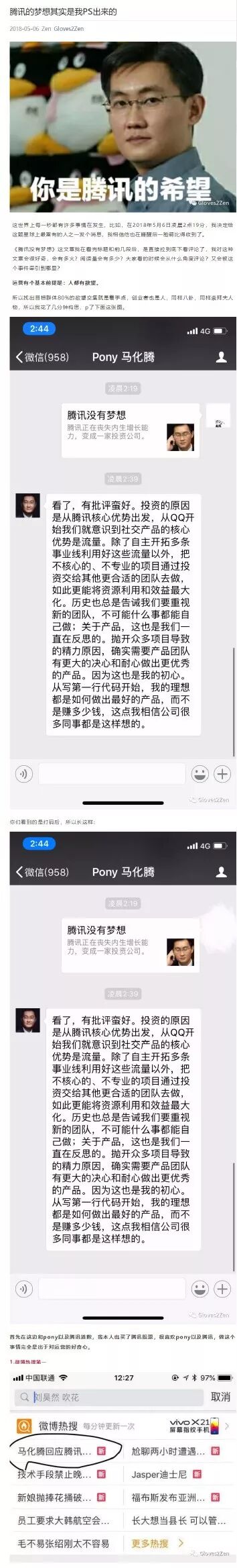 2、5月6日凌晨2点多,一张马化腾微信回应此事的截屏开始流传,(大叔看到是在6日中午左右了),并被众多媒体、自媒体、大V引用,作为继续讨论的依据。