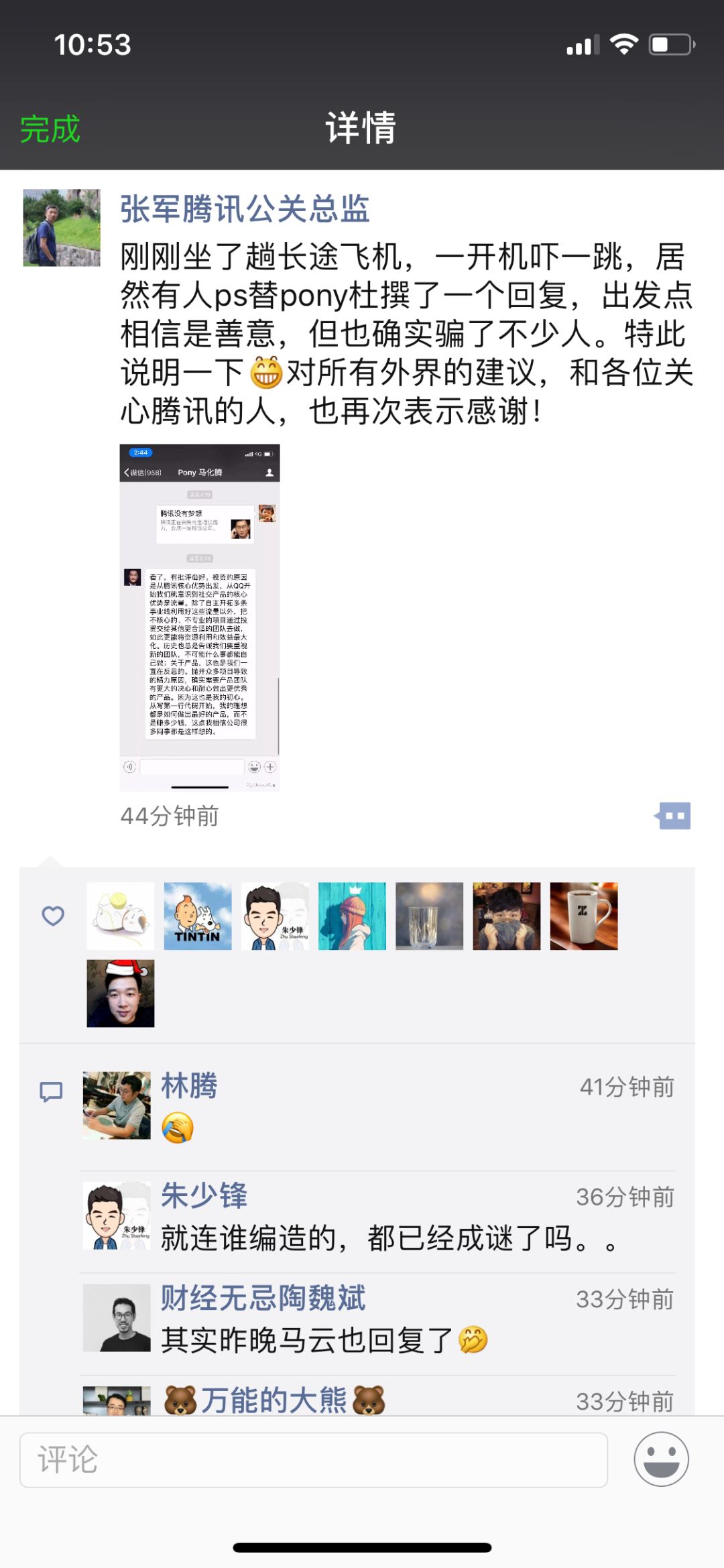 4、5月6日22点09点,腾讯公关总监张军在其朋友圈证实,此截屏为假: