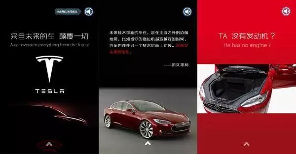 作为最早登录朋友圈的一批作品,特斯拉的这支H5保留了H5最初的模样:精美图片+简单的翻页动效,最终的呈现效果却超越了当时人们对微信营销的想象:原来还可以这样玩!