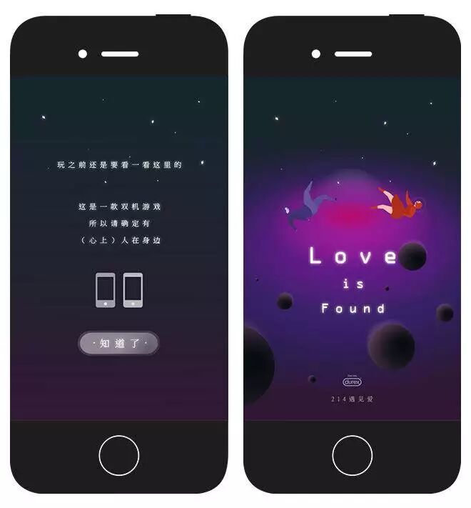 2月中旬情人节杜蕾斯又推出H5《唯你所爱》,这是H5届首次出现双屏互动,即需要两款手机同步操作和呈现画面。页面设计十分唯美,风声虫鸣的音效清新可人,充满浪漫气息。