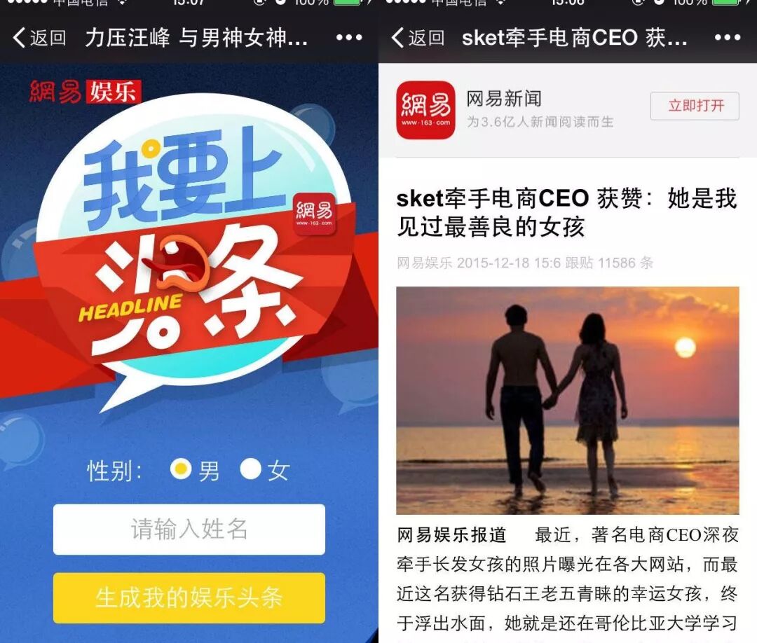 网易娱乐推出的《我要上头条》H5,用户在页面中输入自己的姓名和性别,即可生成一条以自己为主角的网易娱乐新闻。
