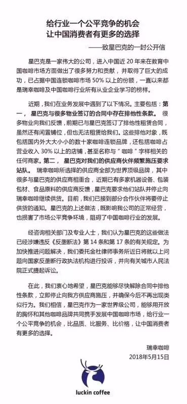 5月15日(今天),瑞幸咖啡发表公开信:遭到了星巴克的反击,很冤枉,请公平竞争啊!
