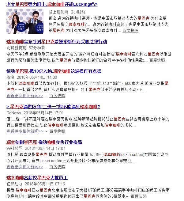 其实,瑞幸咖啡从创立至今,就非常明确地把星巴克锁定为第一目标,大叔搜了一下百度新闻,以“瑞幸咖啡+星巴克”共有近600篇,全是“惊动星巴克”、“剑指星巴克”、“挑战星巴克”、“干掉星巴克”……