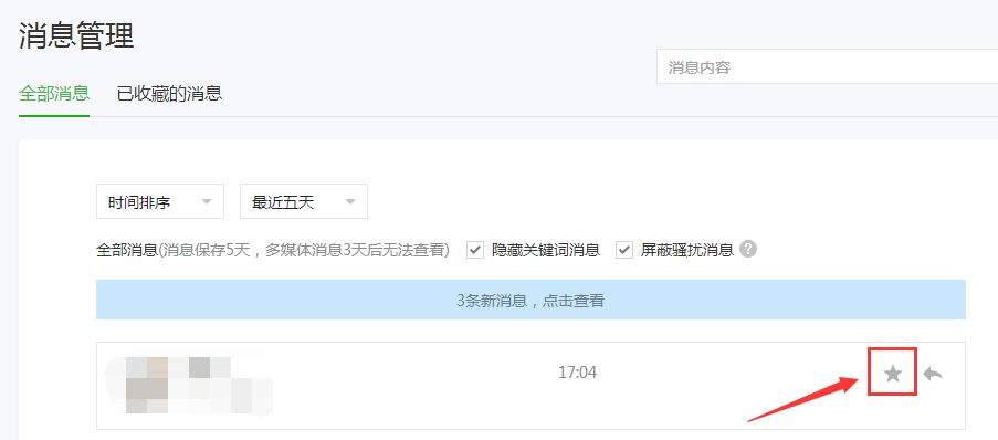 公众号后台的消息只能保留至多5天,点击右侧的“收藏”标识,方便此后随时查看。比如说,福利类互动活动需要获取用户邮寄地址时,收藏的作用就比较大了。