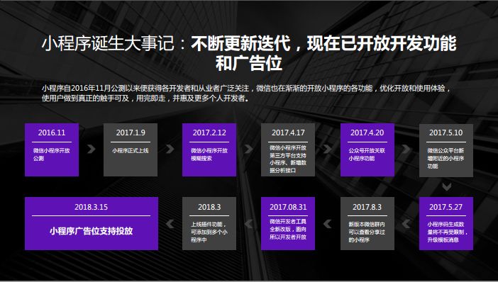 小程序被微信寄予厚望,从2016年开放内测到今天正好是一年半的时间。这一年半的实践中,小程序不断迭代,开放了很多功能,时间节点也非常重要。
