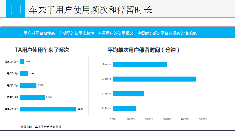 宋晓天表示,“车来了”用户增长基本随微信平台变化而变,此前车来了流量主要源于会话分享,以口碑分享为主,总用户平稳增长。微信增加“跳一跳”小游戏,整体用户入口变化后,车来了用户来源也随之变化,当前来源中任务栏流量排名第一,会话分享和搜索框流量均等,排第二。