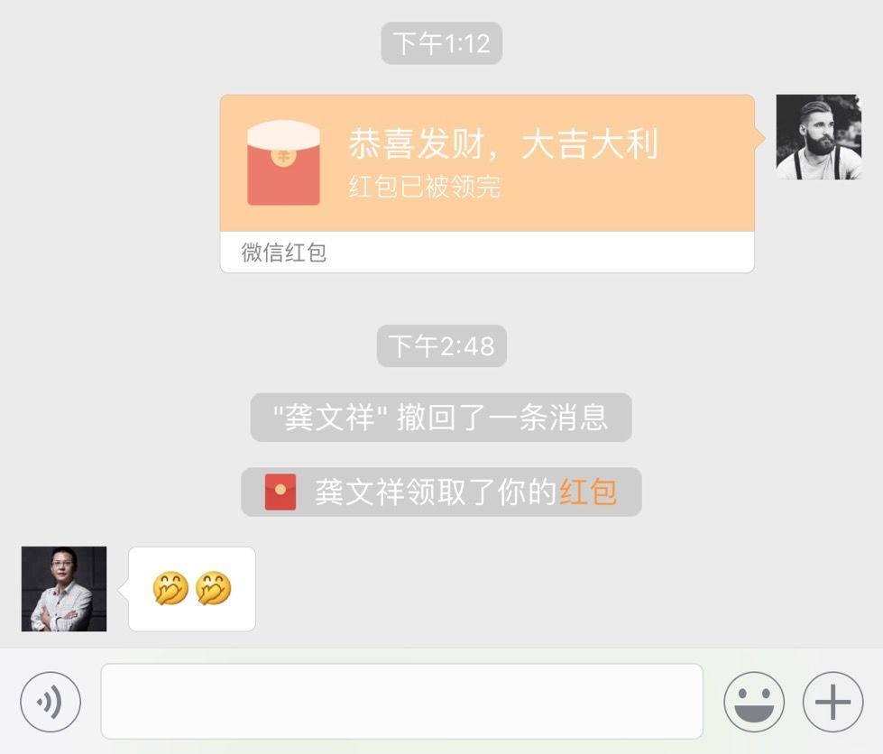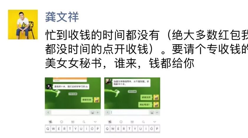 这第一个例子,就是刚刚发生的,在朋友圈刷到了知名微商自媒体人龚文祥老师发的一条状态,龚大师最近出版了一本新的微商书正在推广ing,然后发朋友圈说“忙到连收钱的时间都没有,绝大多数红包我都没有时间点开收钱”,这个就是典型的漏洞营销啊,让大家觉得即使发了红包他也没时间收,就可以免费获得新书了,刺激大家去利用这个漏洞去薅羊毛,先生呢为了验证给龚大师真的发了一个小红包,毫无意外大师收了,整体来说有点尴尬,但是不得不佩服大师营销的功力,人家成功是有成功的理由的,大家别再骂他了。