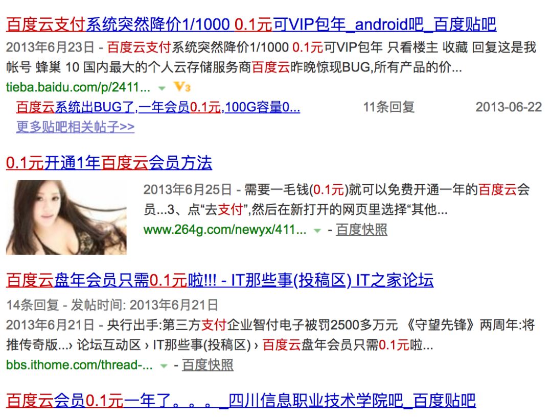 2013年6月21日晚,一则关于百度云支付系统出现重大bug的消息在微博、各大论坛、新闻网站被疯传,百度云上所有产品的价格“变成”了原来的1/1000,只需要0.1元就可以购买原价近百元的会员服务,5毛钱就可以扩到100GB套餐。一时间,大部分不管之前有没有百度云网盘的账号,不管自己平时用不用得上百度云网盘的网民都跑去购买了套餐。