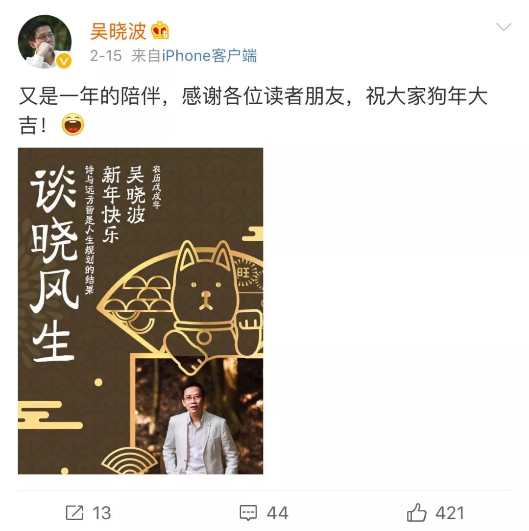 这次活动也吸引了一些名人使用。先是拥有百万级用户的公众号“吴晓波频道”推荐了ARKIE小程序,接着吴晓波本人在微博上发布了自己姓氏生成的拜年海报“谈晓风声”。除夕当天,还有很多大佬们也在朋友圈用ARKIE送起了祝福。