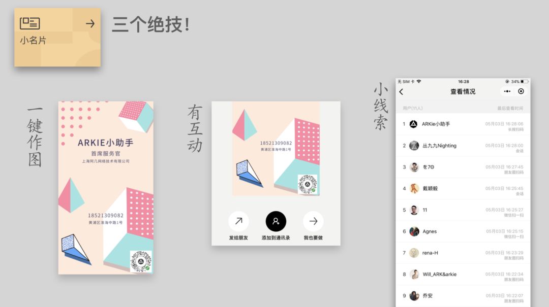 ARKIE也盯上了名片分发场景,主要切入点在于“人与名片的交互线索”,同时也重视名片的设计感。用户可以将海报上的信息一键保存到通讯录,汇总看过你名片的人数,识别是谁通过了哪些渠道查看的海报。ARKIE还支持企业批量定制团队名片模版,这也是日后的变现渠道之一。