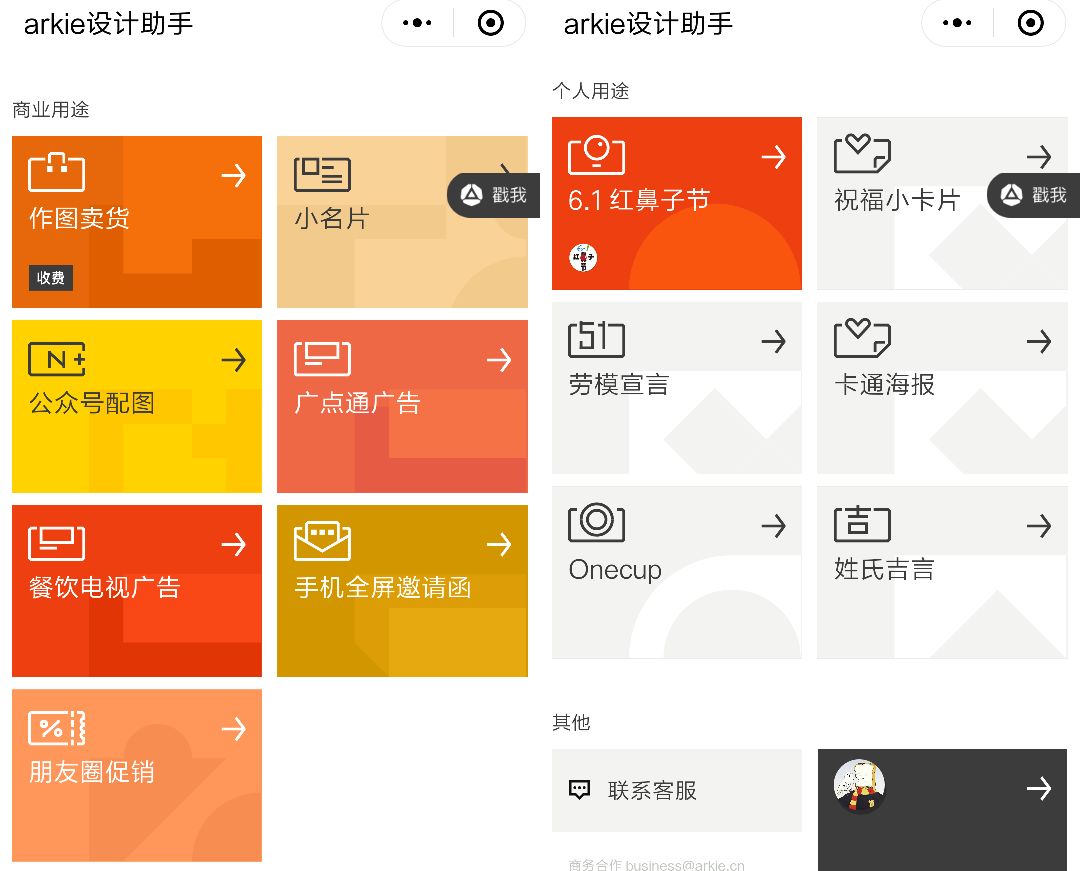 今年2月,ARKIE设计助手小程序版上线。相较于PC端,小程序版更加适配微信场景,功能多样。小程序中分“商业用途”和“个人用途”,前者主要是满足微信场景下的作图需求,后者提供不同类型的卡片模板,供个人在节日或特定场合使用。