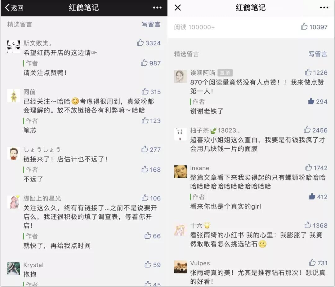 在很多用户眼中,“红鹤笔记”不是网红博主,更像女生的贴心闺蜜。每期推送后,粉丝都会通过留言、私信等方式讨论本期话题,很多粉丝还会主动说出自己的时尚烦恼,向编辑“点播”下期内容,大量用户留言索要购物链接,甚至追问“什么时候开店”。