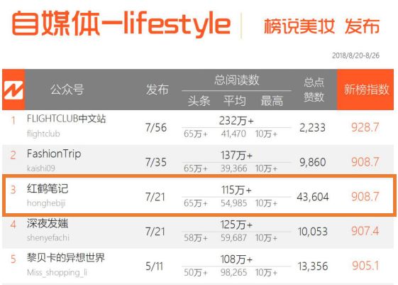 近两年,新媒体内容日渐饱和,很多公众号涨粉陷入瓶颈。“红鹤笔记”却在竞争激烈的时尚领域,占领了一席之地。本周新榜的时尚自媒体榜中,“红鹤笔记”排名第三,总点赞数第一。超过了“深夜发媸”、“黎贝卡的异想世界”、“女神进化论”等老牌时尚公众号。