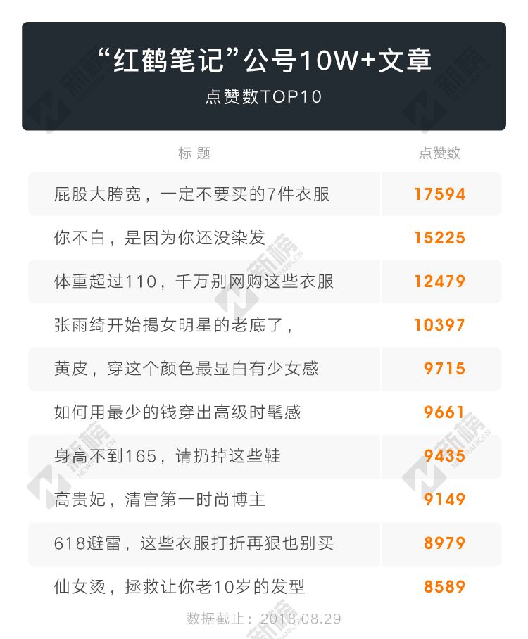 新榜数据显示,截至8月29日,“红鹤笔记”目前推送了540篇文章,其中10w+文章149篇。“红鹤笔记”的内容时令性强,夏天就推《50套最显瘦、显腿长的搭配,一次收齐!》,秋天则写《入秋第一件外套,一定要买它》,粉丝们不禁感慨“鹤鹤这篇来的太及时”。
