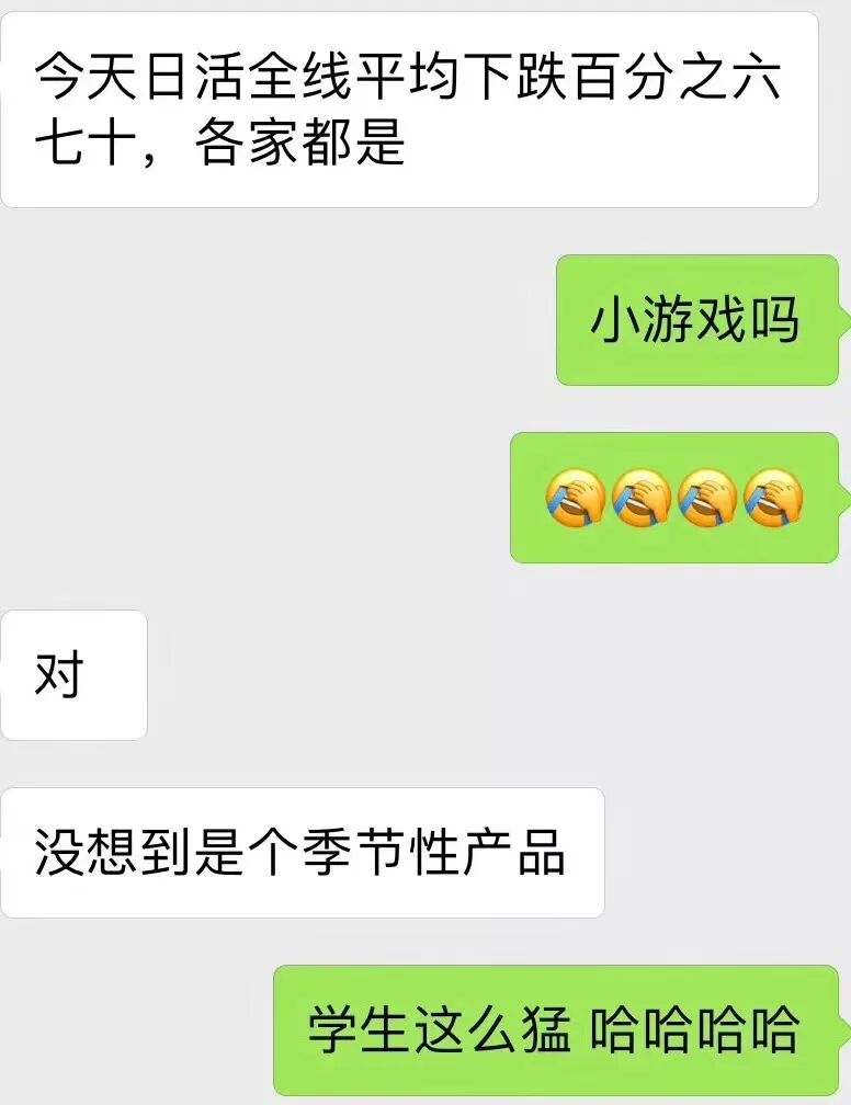 图片中对话双方的身份,我们仍不知道。但是对话中的恐慌已经蔓延到了所有小程序开发者:这两天的小程序是不是日活都跌了?会不会继续跌?小游戏竟然是季节性产品?