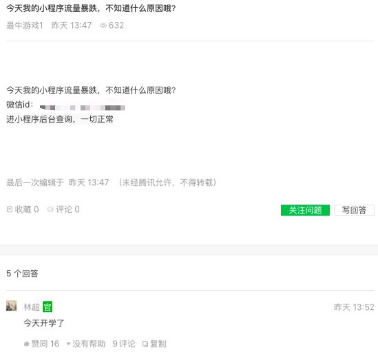 无独有偶,在微信开放社区的开发者专区,一位小程序开发者昨天发帖提问:“今天我的小程序流量暴跌,不知道什么原因哦?”