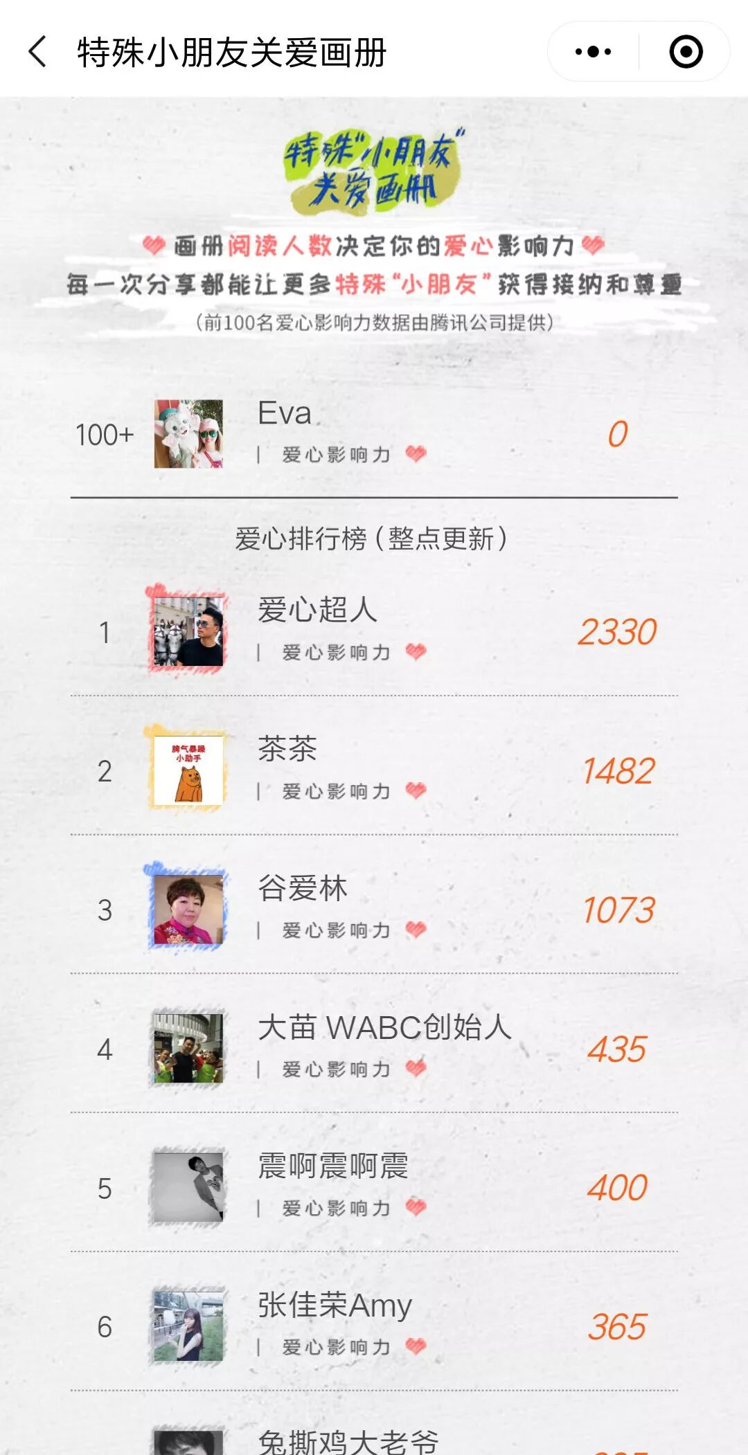 针对小程序自带社交属性这一特性,轻松筹还设计了爱心排行榜。用户在分享小程序或生成的海报后,画册的阅读人数决定了爱心影响力。爱心排行榜整点更新,显示前100位。一方面,爱心排行榜可以鼓励用户分享。另一方面,每一次分享可以让更多人了解“特殊小朋友”,使他们获得接纳和尊重。