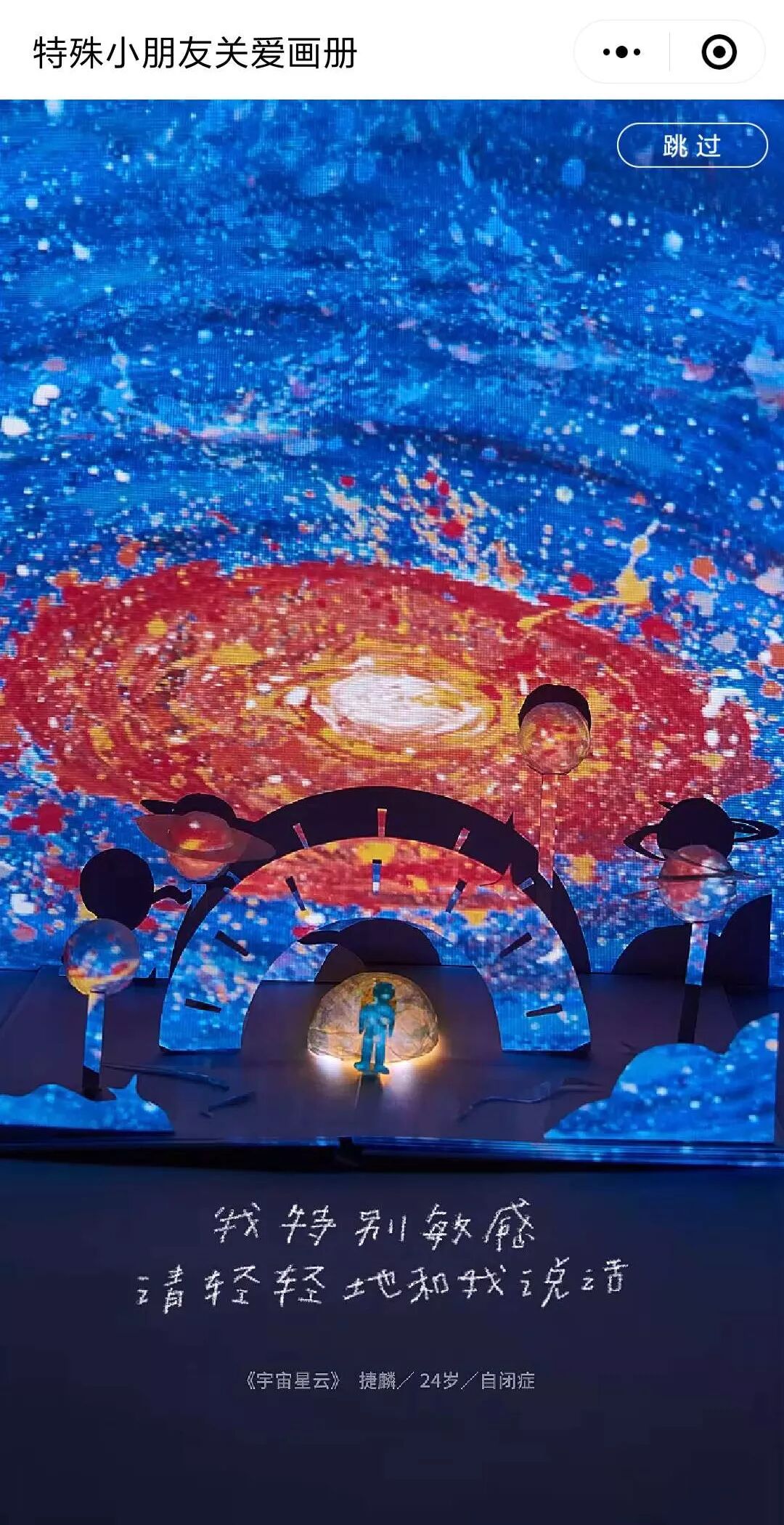 和去年的“小朋友画廊”H5一样,“特殊小朋友关爱相册”的功能也很简单:视频引入-展示画作-挑选画作-输入名字-分享。