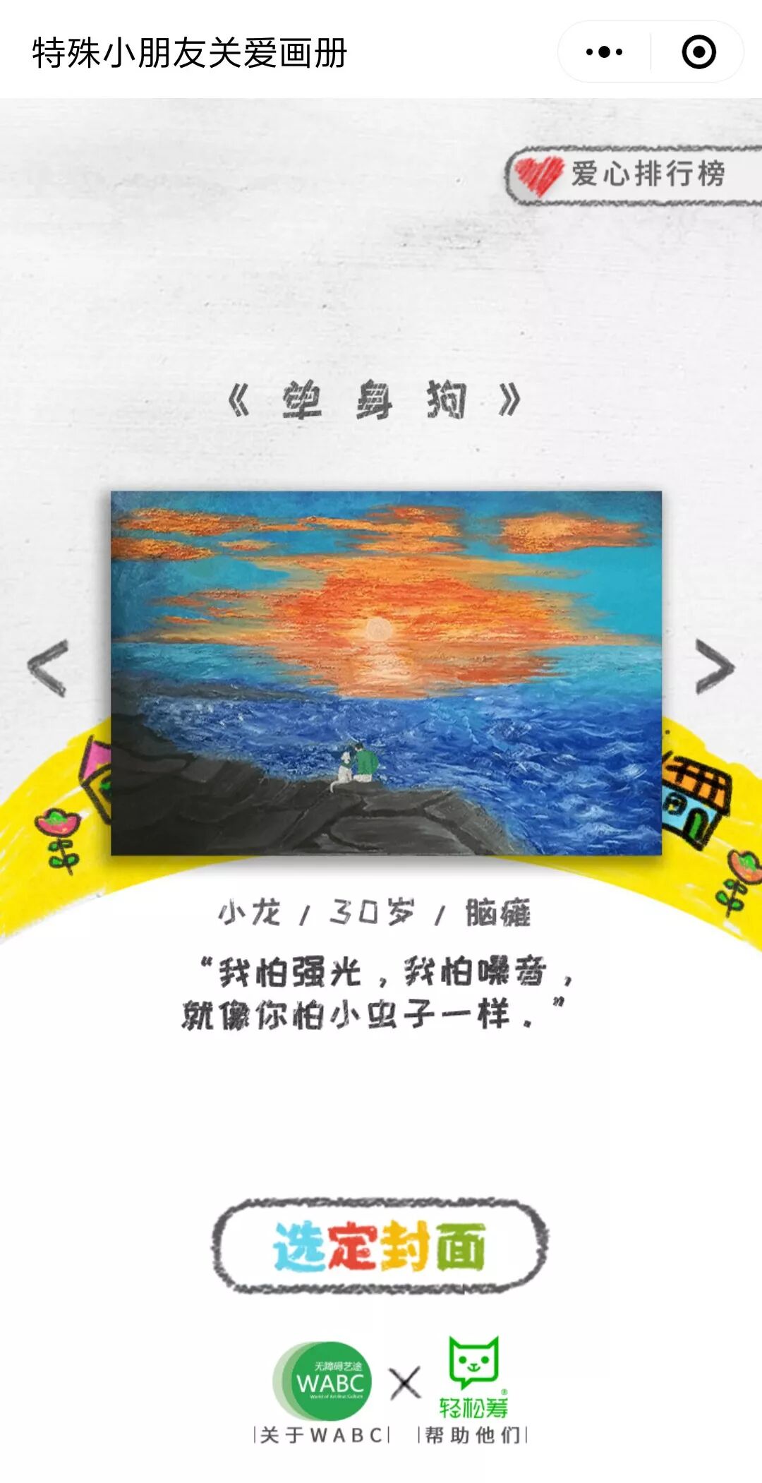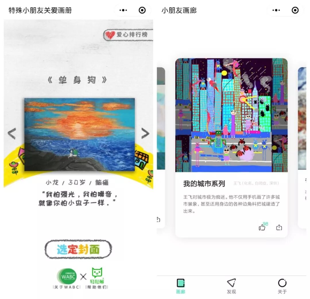 时隔一年,轻松筹和上海无障碍艺途(以下简称为“WABC”)合作,上线小程序“特殊小朋友关爱画册”再度刷屏,被称为第一款刷屏朋友圈的公益小程序。